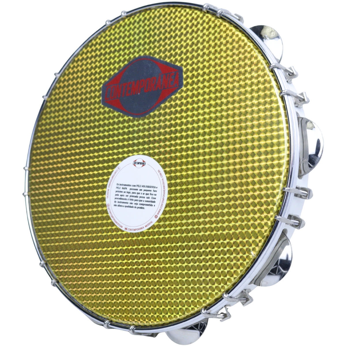 O Pandeiro Contemporânea 12" Branco com Pele Holográfica entrega presença sonora, conforto na tocada e projeção. Seu corpo em jacarandá garante graves encorpados, médios equilibrados e ótima resposta, valorizando cada batida.